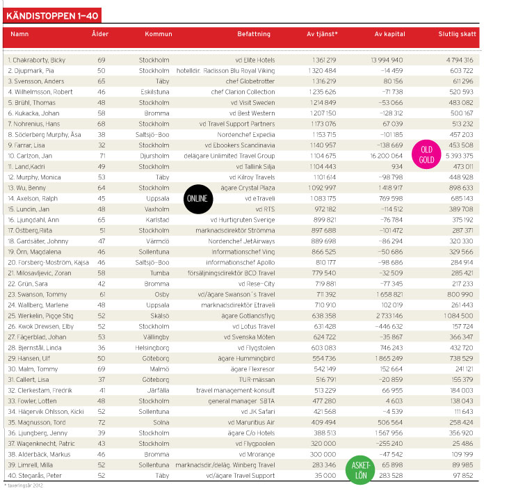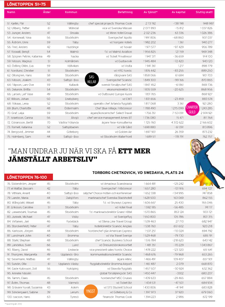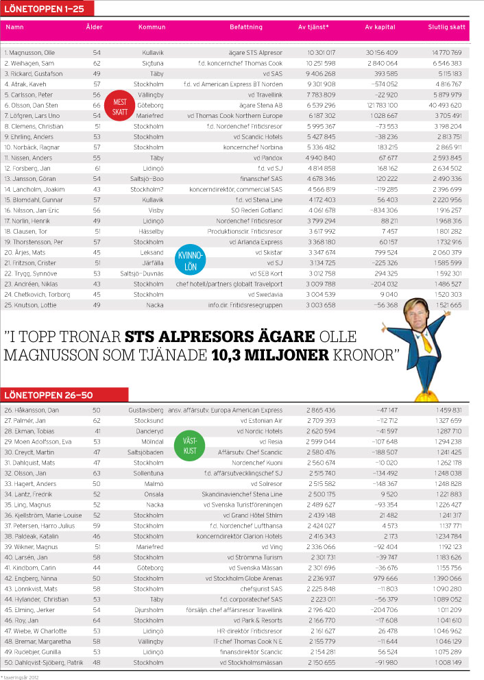 Gemensamt för dessa välbetalda jobb som innehas av män är att det är koncernchefsjobb eller nyckelpositioner på olika nivåer inom internationellt ägda företag inom exempelvis charter och affärsresebyråer – eller inom renodlade transportföretag som SJ, SAS och Stena Line. Den mest välbetalda kvinnan inom resebranschsfären finner vi på plats 22, SEB Korts mångåriga vd Synnöve Trygg, som 2011 hade en taxerad inkomst på precis ovanför 3-miljonersstrecket. Bara några tusenlappar mindre tjänar den näst bäst betalda kvinnan, Swedavias vd Torborg Chetkovich (plats 24).