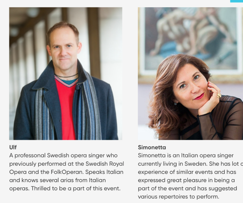 De två sångarna är sopranen Simonetta Cavalli och tenoren Ulf Bergström, båda med erfarenheter från såväl klassiska operascener som gatuopera. Platserna de ska sjunga på har valts med omsorg utifrån sin ”italienska karaktär”. Följande är ungefärliga hålltider.