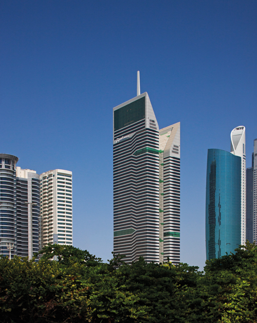 När du bor i det 51 våningar höga glastornet, som utgör hotellet, bor du i hjärtat av det kosmopolitiska Dubai. Fyra restauranger, två barer, pool på taket, spa – och med panoramautsikt över den gnistrande staden.