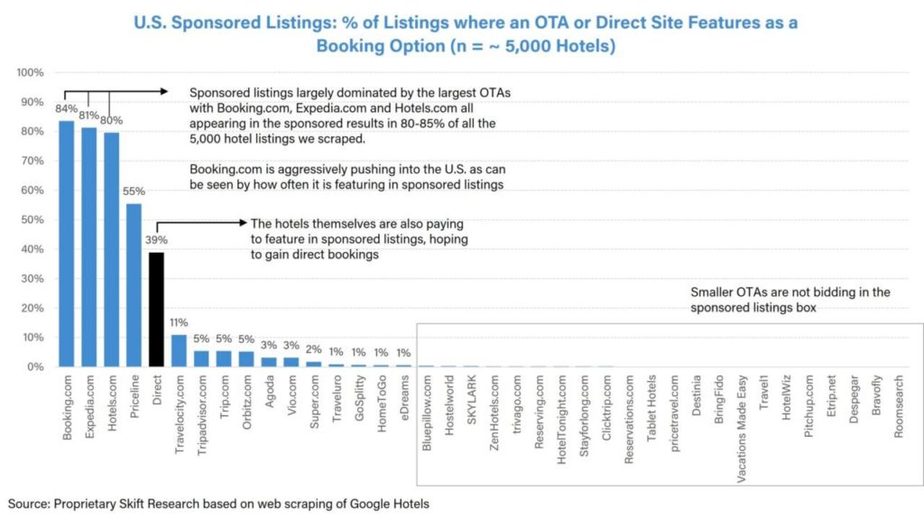 Sponsrade förteckningar över hotell, det vill säga marknadsförda sökresultat som syns högst upp, domineras av de största OTA:erna. Mindre OTA:er är mindre benägna att välja denna budgivning för annonser med hotellreklam. Bakgrunden kan Skift Research endast spekulera om, men företagens olika budgetar dominerar sannolikt strategierna.