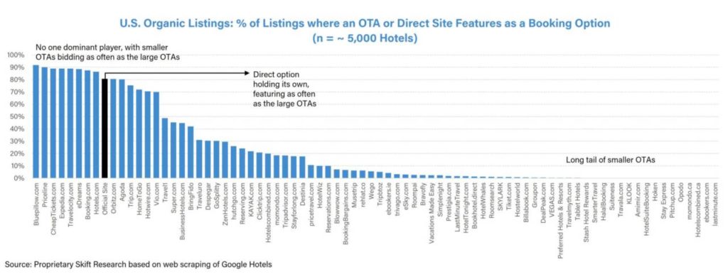 Även om de största OTA:erna dominerar de sponsrade sökresultaten, finns det ingen aktör som är ledande bland de gratis, organiska träffarna. Här dyker Booking och Expedia upp lika ofta som andra OTA:er och officiella digitala distributörer, så som hotellens egna hemsidor.
