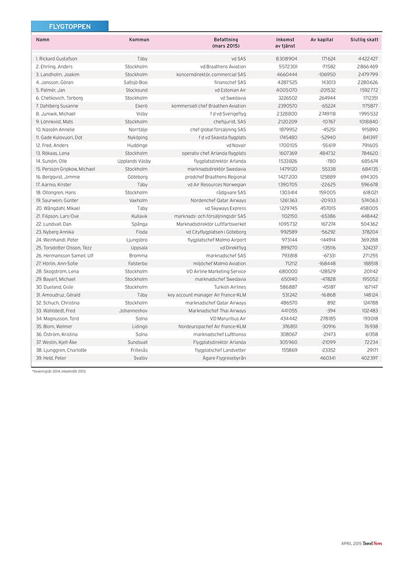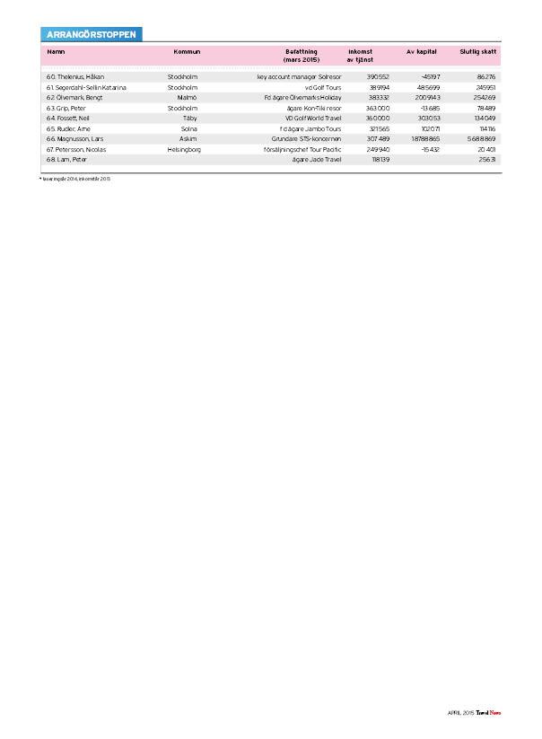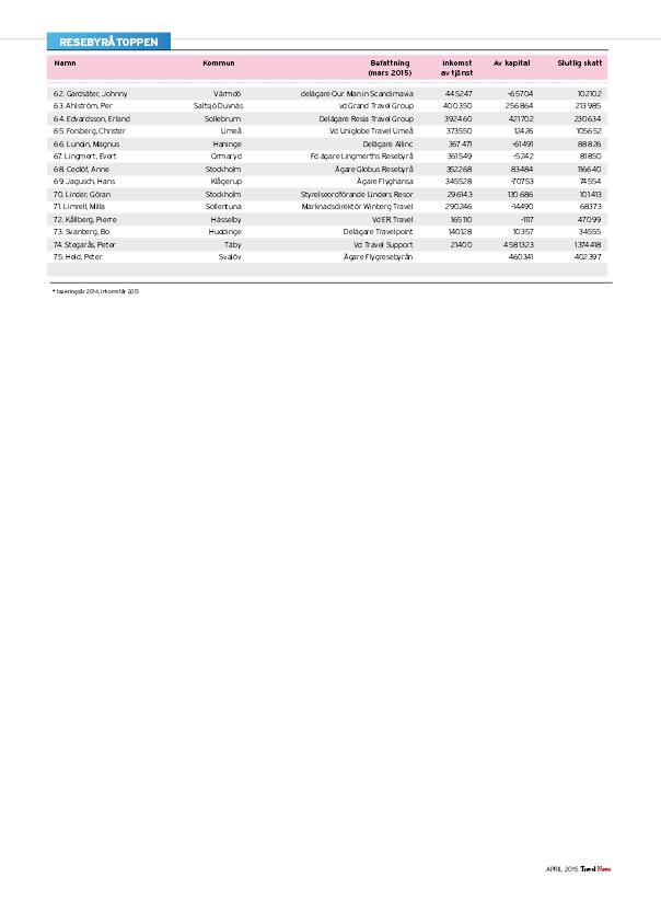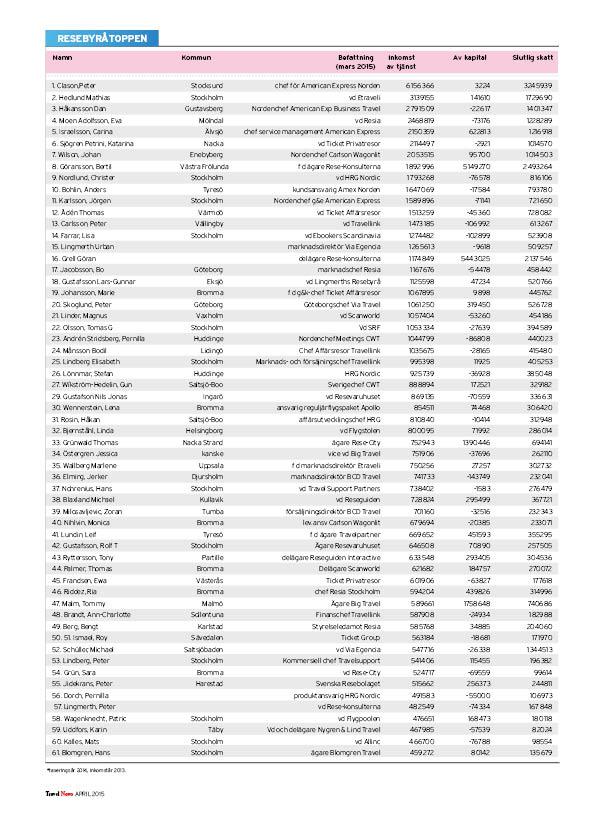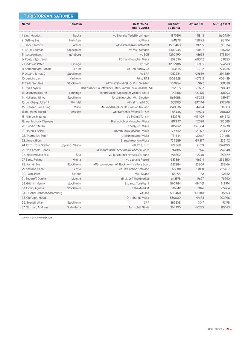 I listorna hittar du toppchefer och kända branschpersonligheter, uppdelat på branschens olika delar: resebyråer, arrangörer, hotell, flyg, övriga transporter, möten, turistföretag och turistorganisationer.