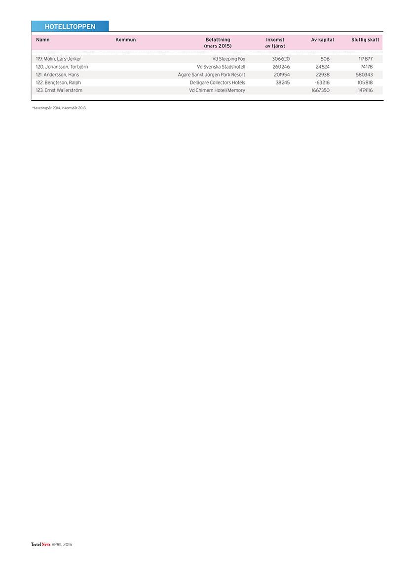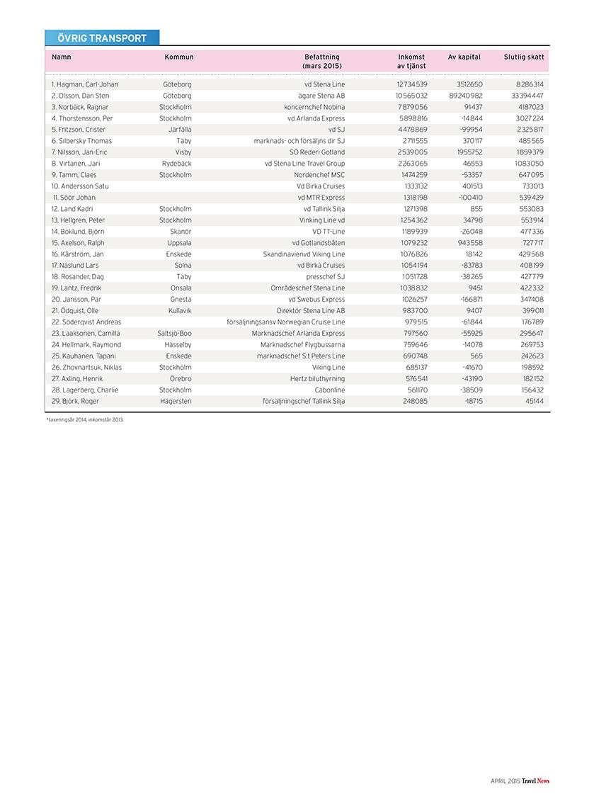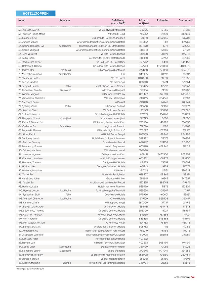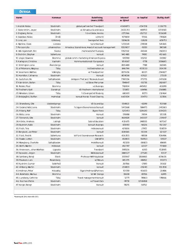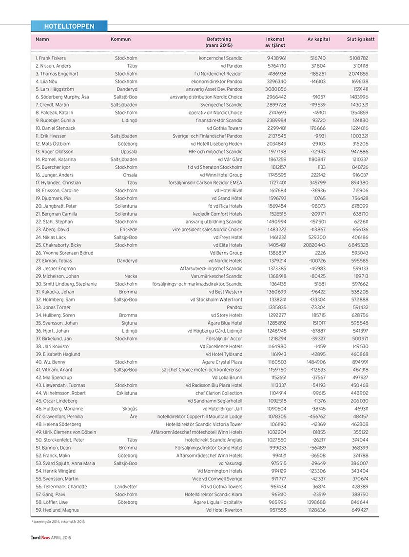 I listorna hittar du toppchefer och kända branschpersonligheter, uppdelat på branschens olika delar: resebyråer, arrangörer, hotell, flyg, övriga transporter, möten, turistföretag och turistorganisationer.
