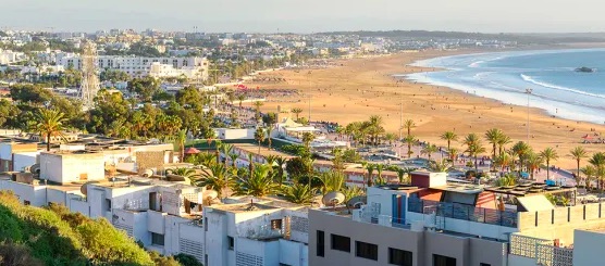 Strandpromenaden i Agadir heter La Corniche och sträcker sig från La Marina d’Agadi och fem kilometer söderut. La Corniche är kantad av restauranger, uteserveringar och tjusiga hotell. Ovanför stranden ligger den mer genuina delen av Agadir med Talborjt-kvarteren, där du kan äta läcker marockansk mat till bra priser. Där finns även affärskvarteren med marknaden Souk eE Had.