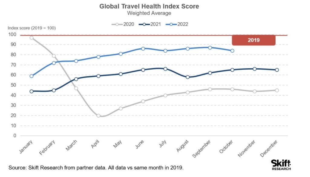 I oktober minskade Skift Travel Health Index med tre procent jämfört med oktober 2019 och stannade på 84 procent, även om det, är 19 procent högre än samma månad 2021.