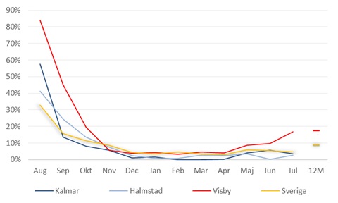 – Allra starkast ökning har medelstora städer haft, där många har gjort uppenbart lyckade satsningar på att locka hemesterfirare. Uppgångarna där ligger på 50-100 procent mot föregående år, och vissa destinationer har haft högre beläggning än vad de hade under juli 2019.