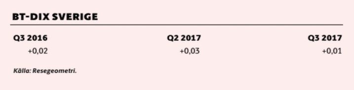 – Efter den förväntade nedgången under sommarmånaderna trodde vi på en uppgång i augusti och september, men uppgången uteblev i år. Istället backade företagens efterfrågan på affärsresor ytterligare under tredje kvartalet. Men BT Dix-indexet ligger fortfarande över noll, vilket innebär att företagen fortfarande räknar med ett ökat resande., säger Jan Borg på Resegeometri Nordic.