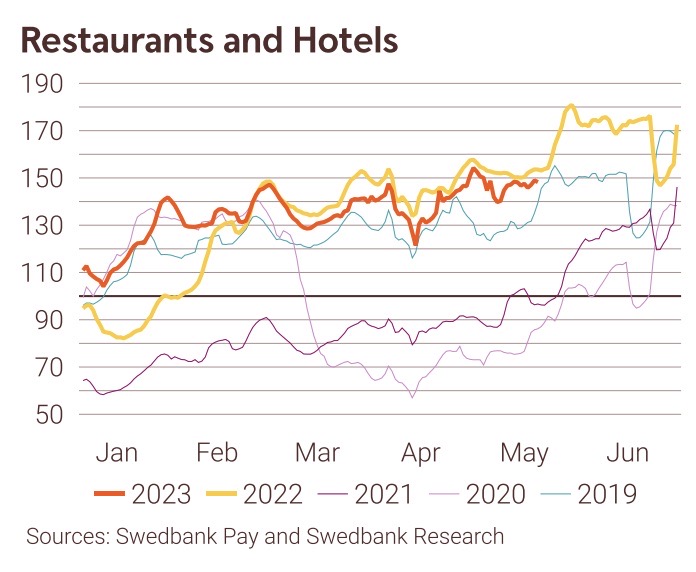 Svenska hotell och restauranger ligger långsiktigt också i dag på nivåer över 2019. Men utvecklingen hittills under 2023 visar svarta siffror efter perioden med jul- och nyår och sportlov. Kostnadskrisen och inflationen har bidragit till att de senaste månaderna visat lägre omsättning än under 2022.
