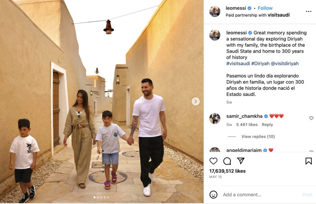 Instagram-inlägget är markerat som ett betalt partnerskap med Visit Saudi, har fått omkring 17 miljoner likes och mer än 78 000 kommentarer. Messi har 472 miljoner Instagram-följare och har då och då gett en glimt av sina resor till Saudiarabien, sedan maj 2022.