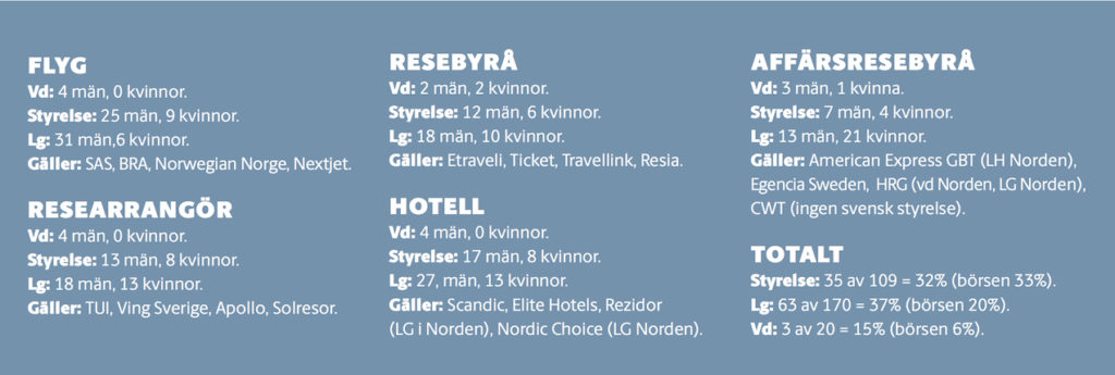 Arrangörer och resebyråer går framåt, med TUI som bra exempel och Etraveli som mindre bra. Ticket har en kvinnlig vd och fyra kvinnliga styrelseledamöter av fem. Resia Travel Group har en styrelse med två av sju ledamöter som är kvinnor, samt en desto mer jämställd ledningsgrupp, med Eva Moen som vd, där fyra män och fyra kvinnor ingår.Sanna Lindgren är HR-chef på Resia. Hon menar att förebilder i toppen skapar en positiv spiral framåt.