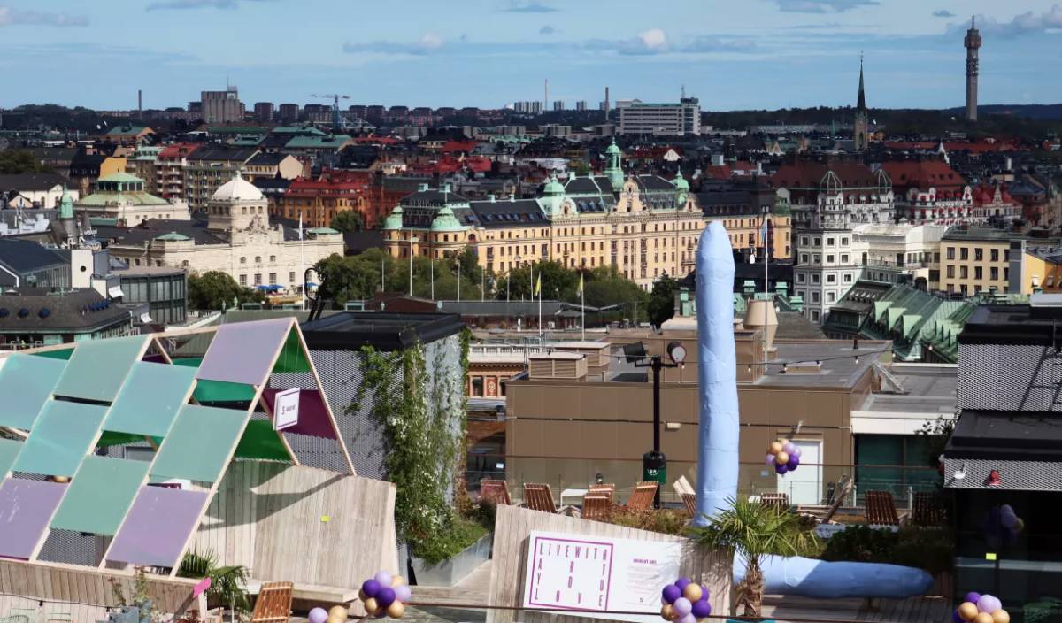 Stockholm Under Stjärnorna är 1200 kvadratmeter takpark med intryck genom musik, mat, dryck, bio och aktiveringar som har fått stockholmare och hitresta gäster att att vallfärda till Brunkebergstorg. Med Franz Wests verk tillförs en dimension till upplevelsen som är okonventionell i restaurangmiljöer. Verkehrtes T som är inköpt av Sune Nordgren till Petter Stordalens Strawberry Art & Design för ett antal år sedan och är idag försäkrad till $650.000 har här verkligen funnit sin rätta plats.