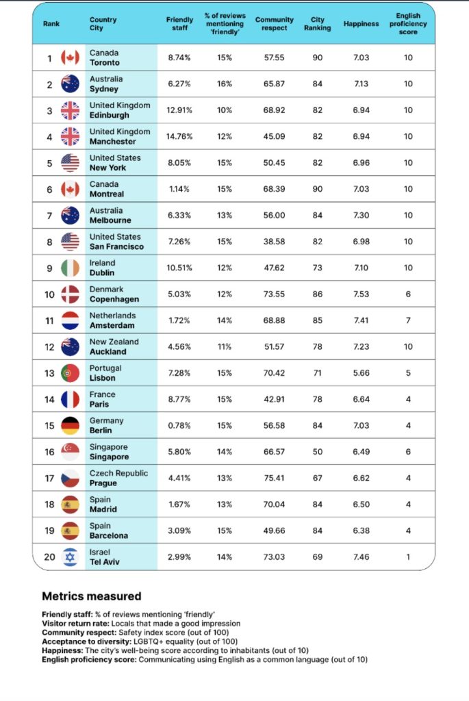 Fast egentligen är Toronto inte ensamma som etta, Preply ger både Toronto och Sydney ett övergripande vänlighetspoäng på 7,97 av 10.