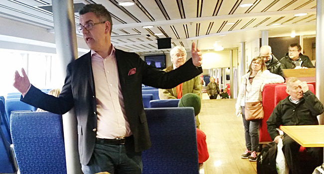 Pigge Werkelin berättar om nya Gotlandsbåten för en grupp nyfikna.