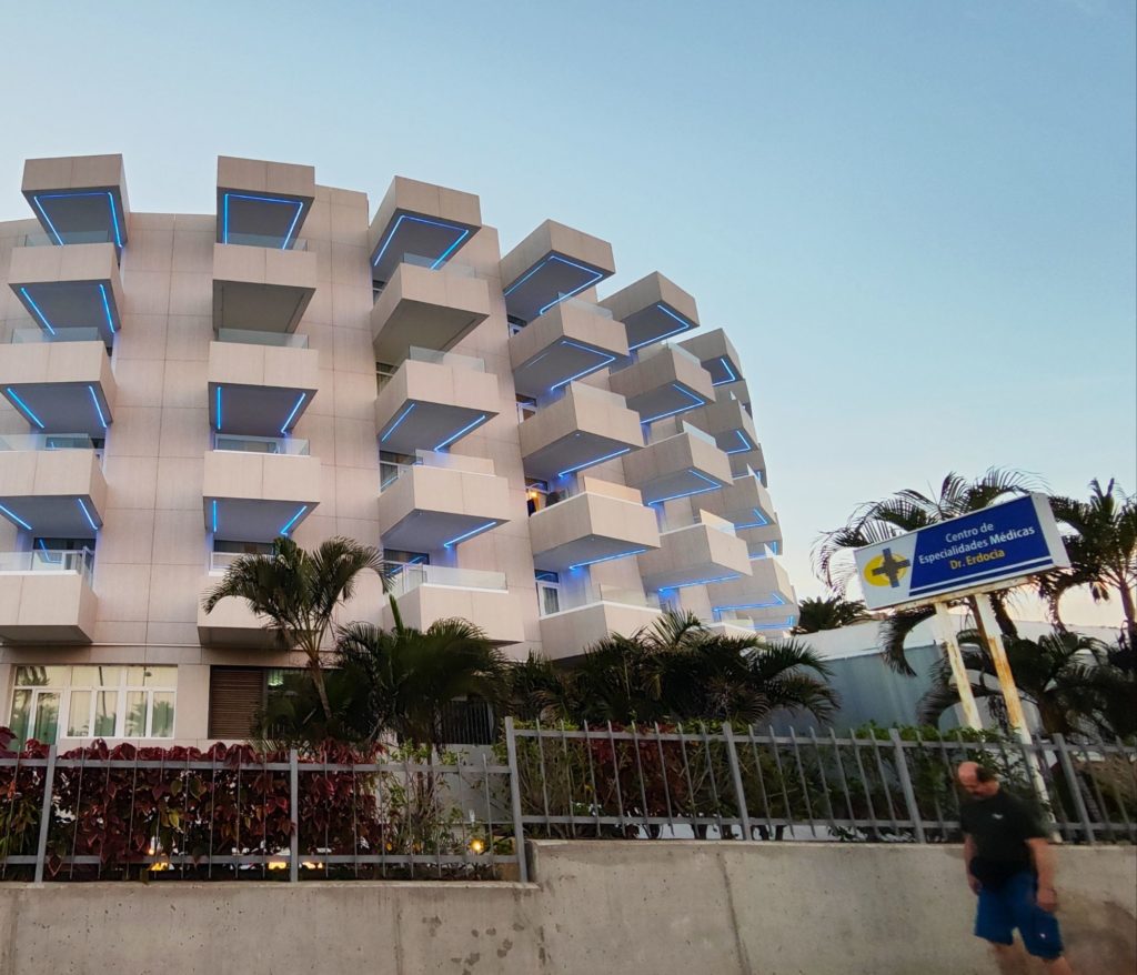 Eftersom det är fullt på Vings egna hotell så tar vi in på Servatur Puerto Azul. Hotellet ligger högt upp på ett berg och smeker ner som en matta över berget i ett stort antal våningar. Precis som många av fastigheterna i närheten är bygget från 70-talet, men har precis fått en rejäl renovering för 55 miljoner euro. För den summan fick man bland annat 142 nybyggda rum.