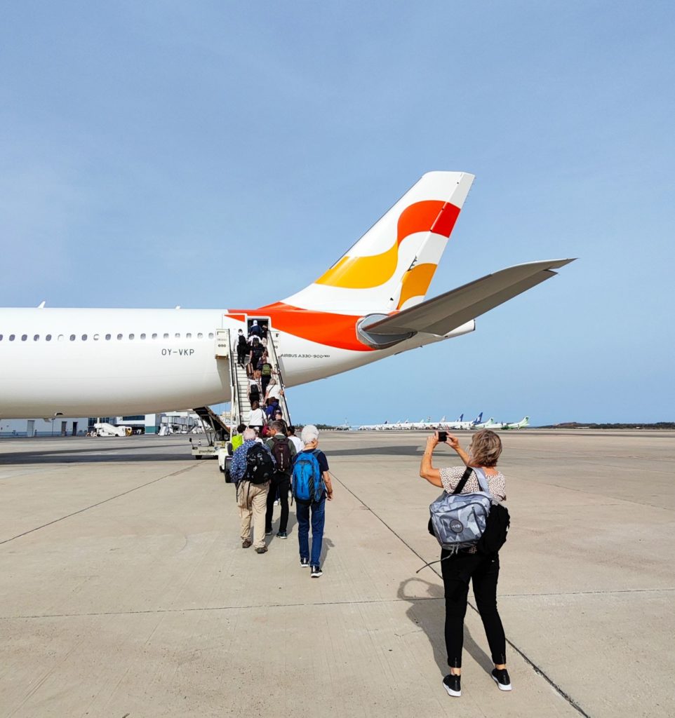 Planet till värmen är en timme försenad från start. Och det är förstås Putins fel. På grund av kriget får inte planen till Thailand flyga över Ryssland. Den längre sträckan gör att Sunclass-maskiner måste mellanlanda i Varna i Bulgarien för att tanka. Där uppstod tekniska problem som innebar att en jourhavande pilot, alltså vår styrman Andreas Andersson var tvungen att åka dit och flyga hem planet. Han måste därefter vila tolv timmar på marken i Sverige för att få flyga igen. Men nu sitter han med Airbus joystick tillsammans med vår danska kapten Sören Krytz. Det är han som styr på resan ner och styrman som sköter detta på vägen hem. När planet kör över Las Palmas och vänder tillbaka för att landa från söder får piloterna en matt applåd när vi når landningsbanan.