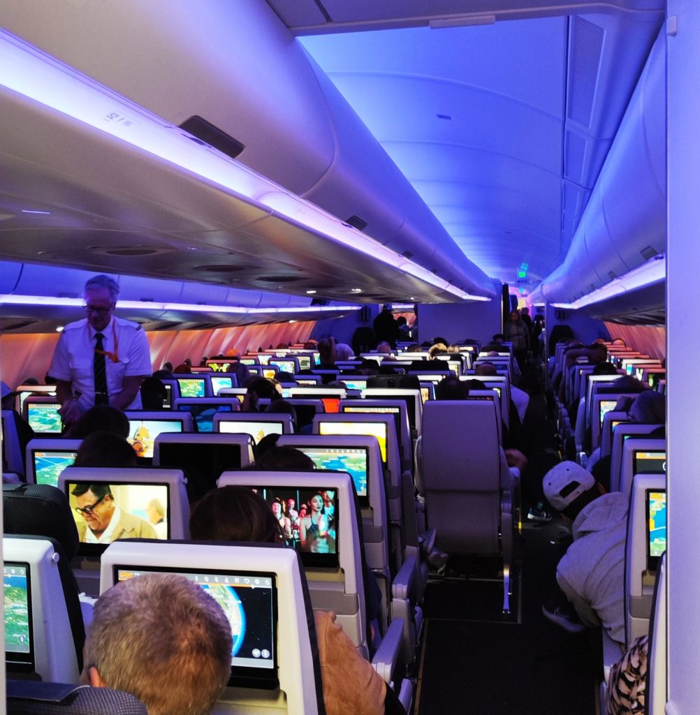 Stämningen i Sunclass tjugo år gamla Airbus ner till Gran Canaria är avslappnad. Det är några tomma säten, men annars är det i princip fullsatt i den 322 stolar stora kabinen. Längst fram finns en premium-avdelning med något bättre benutrymme för gästerna. Undertecknad med sällskap sitter på rad 40…