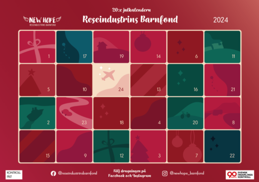 Reseindustrin Högsta vinsten i årets julkalenderlotteri från Reseindustrins Barnfond New Hope är flygbiljetter till Dubai för…