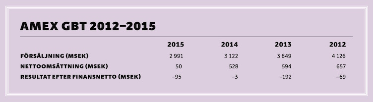 Enligt Bohlin var det fortfarande omgörningen 2014 när American Express Global Business Travel, GBT, blev ett fristående joint venture-företag som spökade 2015. Med affären följde omstruktureringskostnader av engångskaraktär. Dessutom krävdes investeringar i teknisk infrastuktur, men villkoren i det avtal som slutits med Amex i Storbritannien, som ska stödja och utveckla affärsverksamheten i Sverige, tyngde de svenska finanserna och försenade årsrapporten.