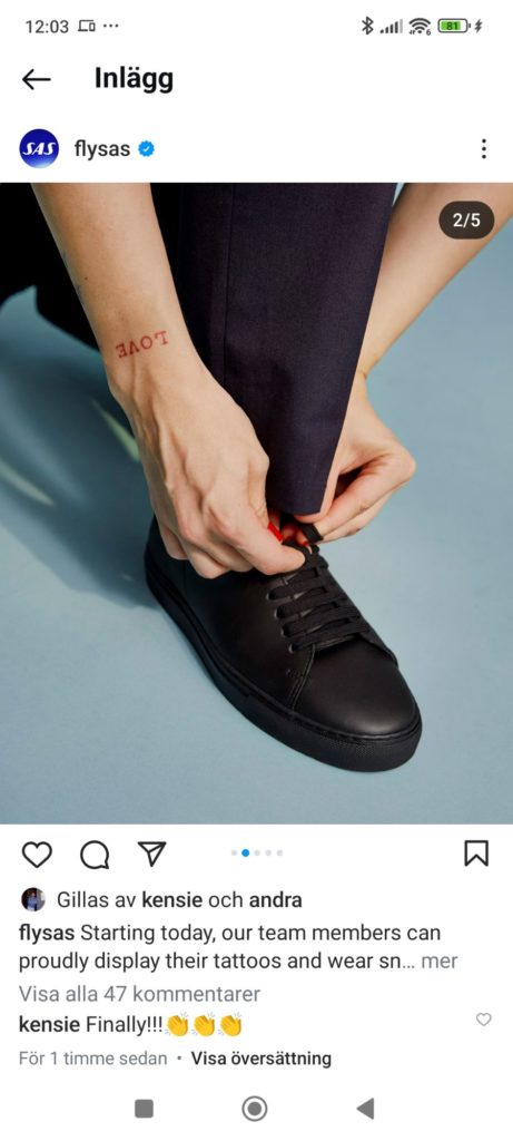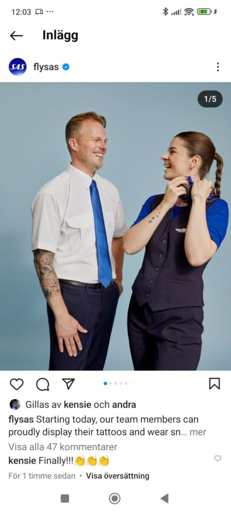Flygbolaget gör detta för att bli ett mer inkluderande och välkomnande företag. Och i kommentarerna på Instagram är det många tumme upp och Kensie, mer känd som krögaren och stewarden på SAS, Kenneth Hallström skriver: “Äntligen!!!!”.