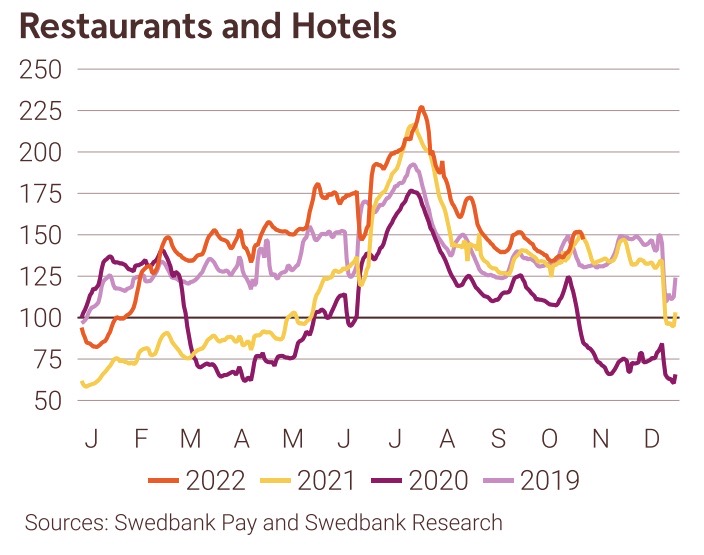 Omsättningen på restauranger och hotell låg under senvåren och sommaren en bit över den 2019 och 2021. Men nu är den uppgången uppäten, visar Swedbank vars statistik baseras på faktiska korttransaktioner.