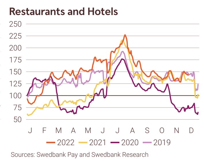 Konsumtionen på restauranger och hotell när Sverige nu har den första julperiodens sedan 2019 utan restriktioner, visar Swedbanks Macrodata som bygger på faktiska korttransaktioner de senaste fyra veckorna (till 10 december). Konsumtionen ligger på nivåer motsvarande 2019. Samtidigt sjunker den totala konsumtionen till nivåer som motsvarar hösten 2020.