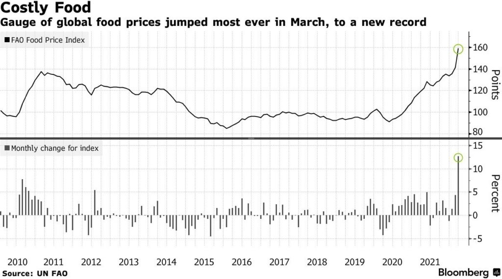 De globala livsmedelspriserna stiger samtidigt i den snabbaste takten någonsin. Kriget får förödande inverkningar på försörjningskedjorna i ”kornboden” vid Svarta havet, de globala handelsflödena begränsas med växande hot om brist på varor som vete och matolja. Matpriserna som steg redan innan kriget började stiger nu enligt FN:s index över världskostnader med ytterligare 13 procent förra månaden.