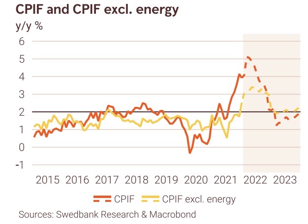 Swedbank tror på en snabb utveckling av konsumentprisindex under våren, men att utvecklingen mattas av under hösten och 2023.
