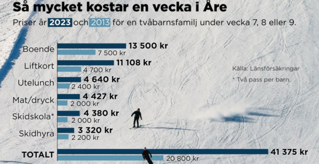 Samtidigt har kostnaderna för en vecka i de svenska fjällen ökat stadigt de senaste åren. I vinter beräknas en sportlovsvecka i Åre i genomsnitt kosta 41 375 kronor för en familj med två barn. Omkring 5 000 mer än fjolårssäsongens 36 286 kronor.
