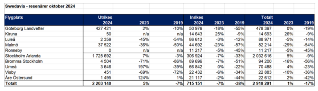 Under oktober reste drygt 2,9 miljoner resenärer via Swedavias tio flygplatser. Flygresandet i oktober ligger en procent högre jämfört med oktober 2023.