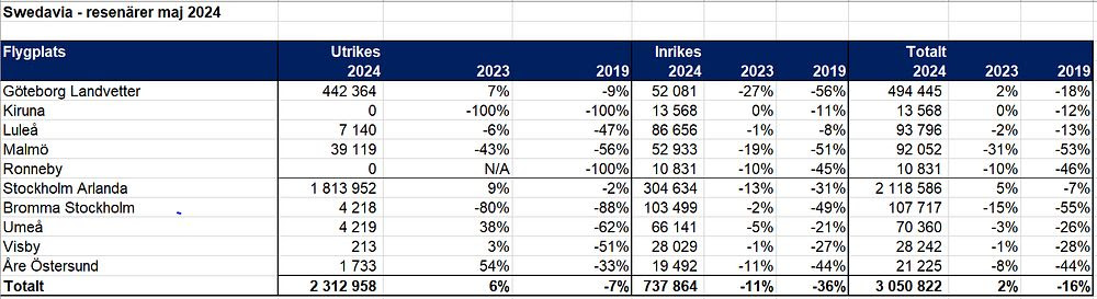 Totalt under maj reste drygt 3 miljoner resenärer via någon av Swedavias tio flygplatser. Det är en ökning med 2 procent jämfört med maj i fjol.