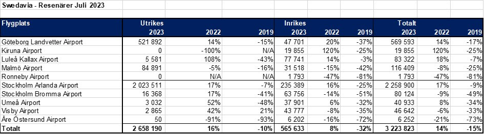 Totalt reste drygt 3,2 miljoner resenärer via Swedavias flygplatser under juli, vilket är en ökning med 14 procent jämfört med juli 2022 och utgör därmed 85 procent av resandet före pandemin 2019. Senast Swedavias flygplatser hade över 3,2 miljoner resenärer under en enskild månad var i oktober 2019.