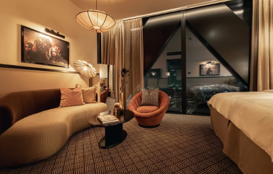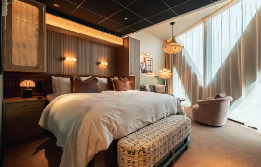 Inredningen på Jacy’z är inspirerad av glamouren från 60-talets Las Vegas där alla detaljer går i en luftig, sofistikerad färgskala som balanseras av spännande textilier och extra fluffiga kuddar. Den varma träinredningen möter elegant marmor, ofta i geometriska mönster som verkligen tar för sig. 41 av rummen på Jacy’z Hotel & Resort går under namnet JQ och bjuder på sin egen personlighet och koncept – det är hotellet i hotellet. Här erbjuds genom småskaligheten en exklusivare upplevelse och en hemlig speak easy bar bakom en massiv mässingsdörr.