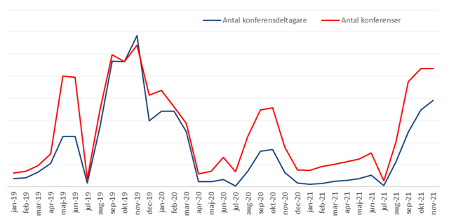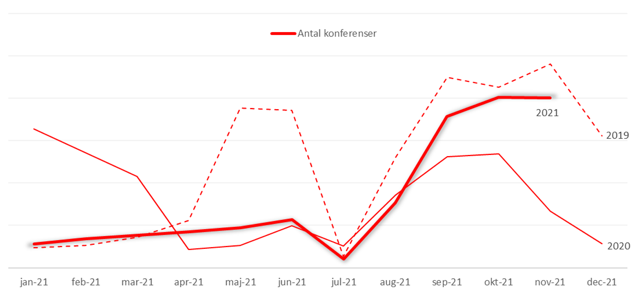 Antalet konferenser är nästan tillbaka på 2019 års nivå, men med färre deltagare. Återhämtningen i Stockholm går dock ändå sakta, i november stod två av tre rum tomma. Av: Leif Holmkvist.