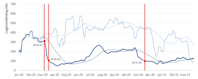 – Hösten 2020 inträdde effekten redan när restriktionerna kommunicerades. Vi har sett att framför allt företag gärna tar det säkra för det osäkra och begränsar sammankomster även innan restriktioner införs, och i större utsträckning än vad restriktionerna kräver. Om vi återigen ser restriktioner på antal personer som får träffas så kommer vi sannolikt att få en negativ effekt på hotellmarknaden, även om mer riktade restriktioner och nyttjande av covidpass kan mildra följdverkningarna.