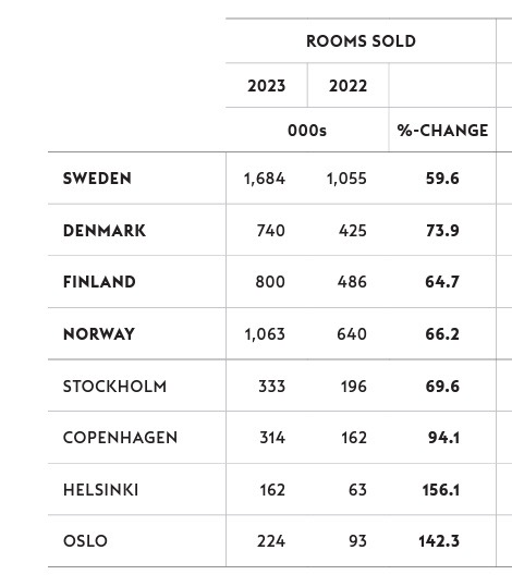 Jämfört med de nordiska länderna visar dock Sverige sämre siffror. Som nation utmärker sig Danmark med flest sålda rum och bland huvudstäderna är det Helsingfors och Oslo som har starkast utveckling.