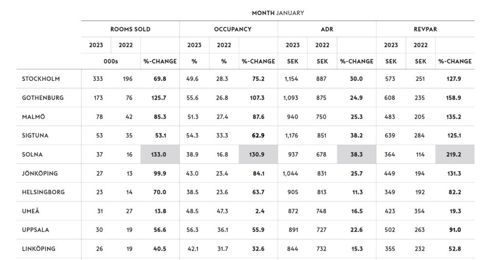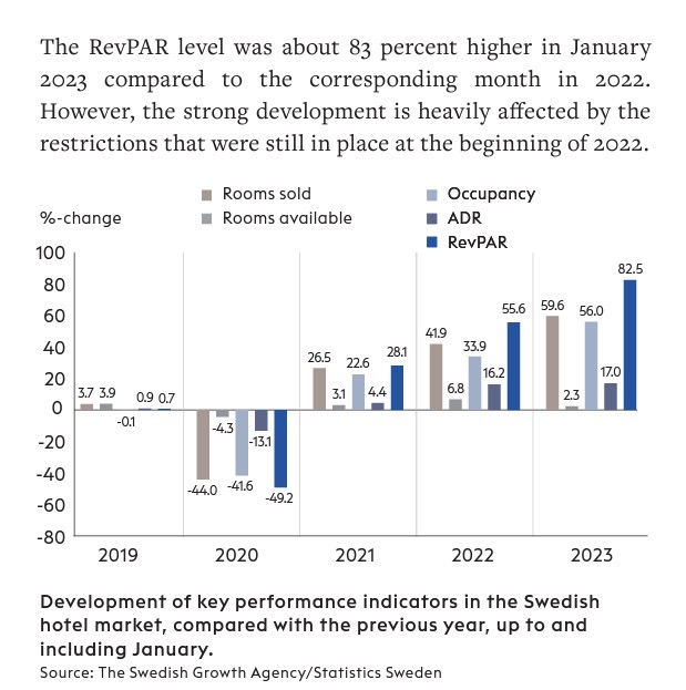 Men de starka månadssiffrorna är dock hårt påverkade av de restriktioner som fortfarande fanns i januari 2022. Men statistiken från januari 2023 är också stark jämfört med januari 2019 där till exempel ADR var cirka 10 procent högre och RevPAR-nivån cirka 4 procent högre.