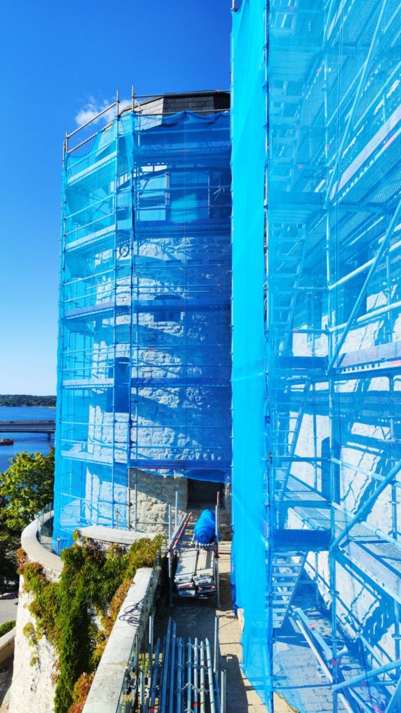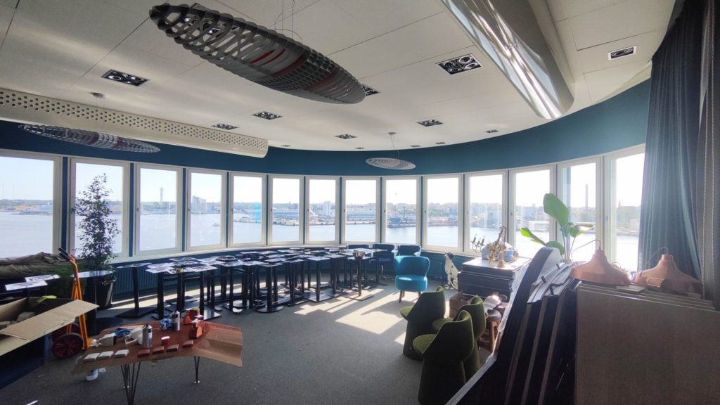 Vi rör oss genom en gång och in i Villa Forestas andra huskropp som utgörs av den gamla borgen. Här är det fler valv och här finns en liten hiss med plats för högst två personer plus bagage. Utsikten mot Värtahamnen och Stockholms östra inlopp är än mer intagande. Det är i denna del som hotellets spa ska växa fram när etapp 1 går i mål till helgen. Det blir ett gäng mindre pooler inomhus och utomhus, flera bastukoncept och ett litet gym med magnifik utsikt. Deadline är våren 2025.