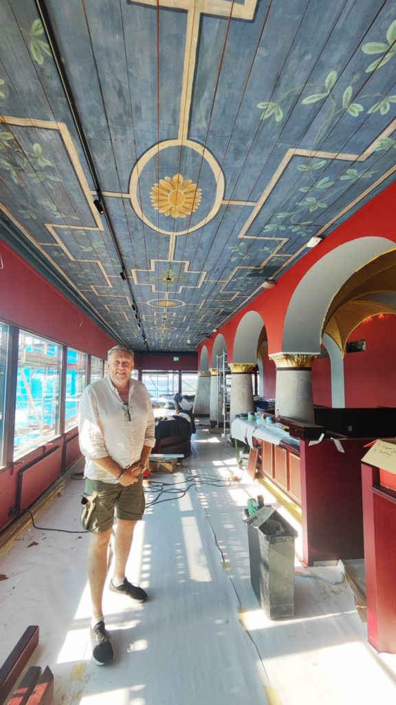 I det lilla rummet som efter renoveringen har direkt kontakt med receptionen står ett gammalt piano som Torbjörn hittade i källaren. I ett rum bakom biblioteksbaren finns ett av husets lekrum för vuxna. Här kan man om några dagar spela shuffleboard, pingis, biljard och dart. Vi går vidare till ytterligare ett bibliotek. Här står Torbjörn Blomqvists hustru Anette och sätter upp böcker på hyllorna. De har varit gifta i 26 år. Jag frågar Anette hur Torbjörn förändras under tiden och får svaret att “det har bara blivit bättre”.