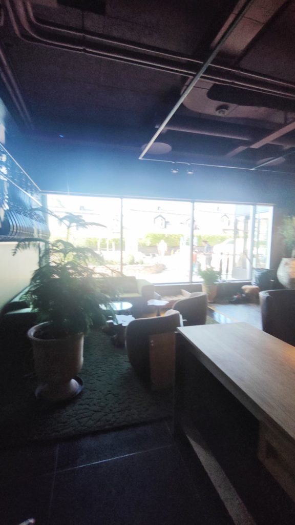 Vi går ut på uteserveringen som är en halvtrappa nedanför entrén och biblioteksbaren. Här blir det en bistro och en bar. Utsikten mot Norra Djurgårdsstaden, Stocksund och Danderyd är storslagen. I horisonten ser jag några av huvudstadens högsta hus: Kista Science Tower och Victoria Tower.