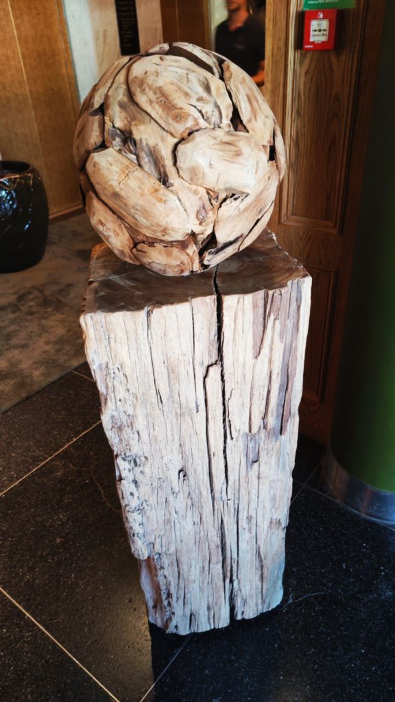 Vi går mot ett gammalt konferensrum en halvtrappa upp till höger om receptionen. På vägen passerar vi en boll på en piedestal, båda gjorda av gammalt trä.