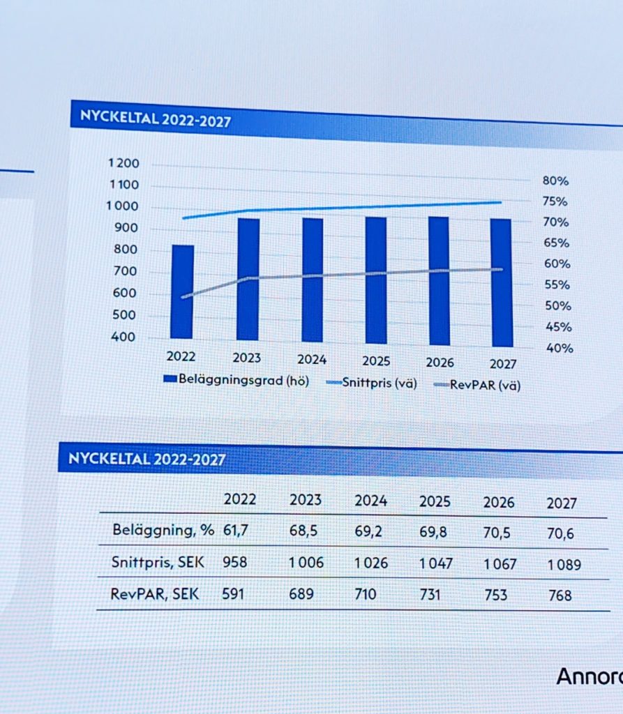 Det gör att RevPar, alltså intäkten per tillgängligt hotellrum, sakta kommer att pressas uppåt liksom beläggningsgraden. I Malmö kan man komma över 700 kronor och 69,2 procent redan 2024 om vi ska tro på Annordias prognoser.