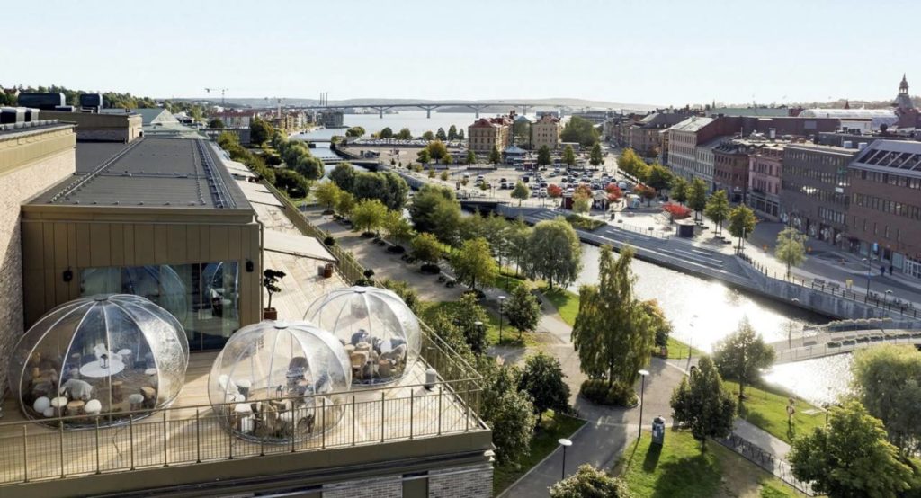 Kirunas nya landmärke Hotell Kiruna är tolv våningar högt och placerat intill stadshuset vid torget i nya Kiruna centrum. Hotellet har 231 rum, restaurang, konferenslokaler, gym, relaxavdelning samt en skybar högst upp med utsikt över Kiruna.