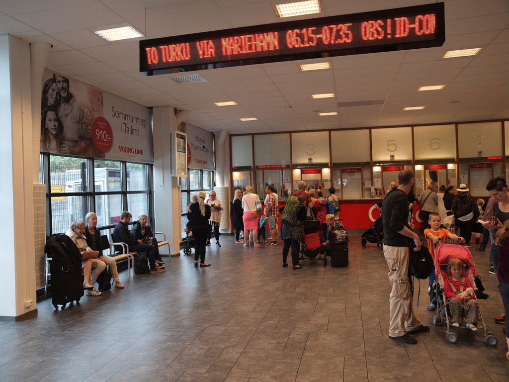 När jag och mina två sportlovslediga söner ska gå in i terminalen kör vår taxichaufför fel så att vi hamnar i lavafloden av lastbilar som ska av färjan samtidigt som vi ska gå ombord. Det är en smula läskigt, men slutar förstås bra. Inne i terminalen möts vi av Viking Lines representanter som ger oss våra biljetter.