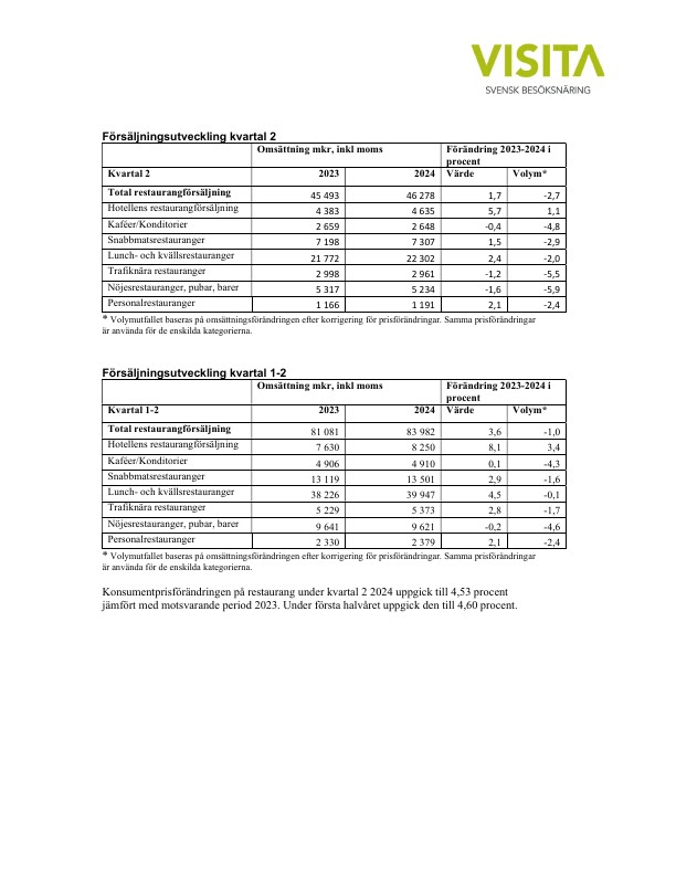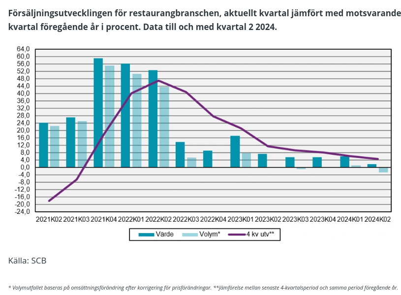 Restaurangernas totala försäljningsvolym minskade med 2,7 procent under andra kvartalet 2024 jämfört med motsvarande period föregående år. Lägst utfall hade nöjesrestauranger, pubar och barer (-5,9 procent). Högst utfall hade hotellens restaurangförsäljning (1,1 procent). I löpande priser ökade den totala restaurangbranschens försäljning med 1,7 procent under andra kvartalet, jämfört med motsvarande period föregående år.