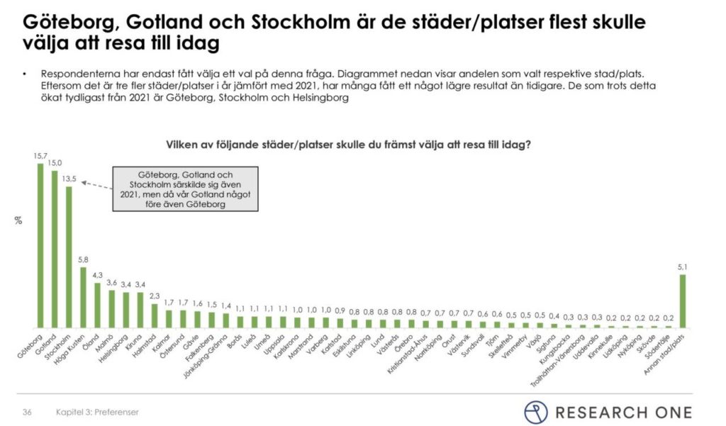7 000 svenskar har i undersökningen fått svara på frågor om hur de ser på sitt resande framöver. Resultatet visar att intresset för att resa i Sverige fortsatt är starkt, särskilt storstäderna är populära.