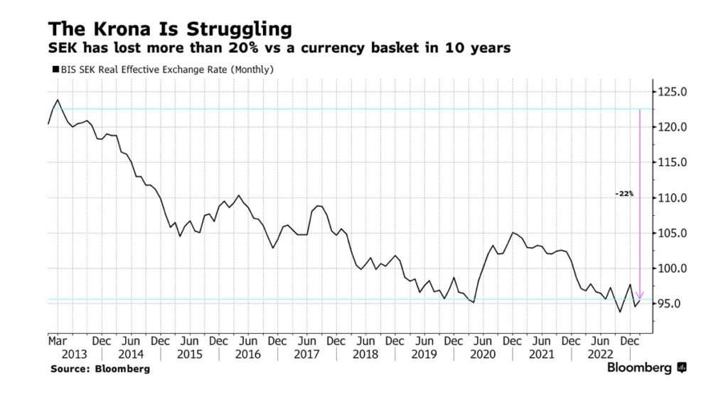 Kronans svaghet är en huvudvärk för svenska Riksbanken när den bekämpar nästan tvåsiffrig inflation. Det har lovat högre räntor och påskyndat försäljning av tillgångar för att stödja valutan.