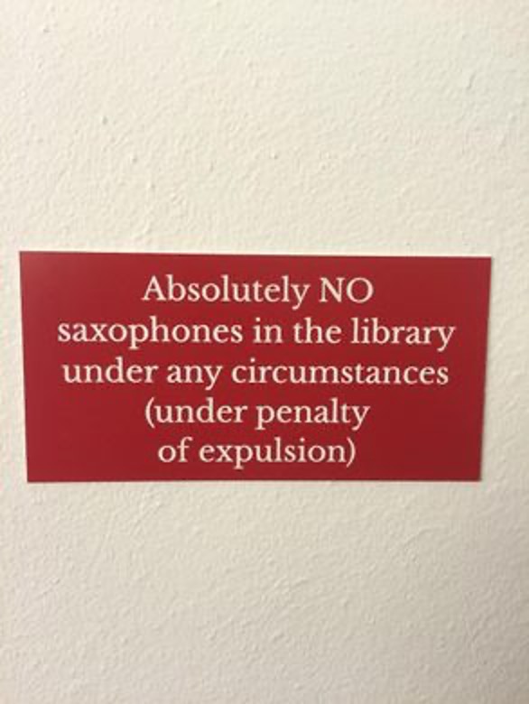 Bibliotekspersonalen skämtade vidare och la ut en notis som sa att när de nu uppmärksammats på saxofonproblemet hade de tagit steget att även förbjuda dragspel, tamburiner och banjos. Sedan dessa regler trädde i kraft har de dock inte prövats skarpt en enda gång. Ingen SSE-student har hittills blivit bortförd för att ha tagit med sig en saxofon till biblioteket. Huruvida det bara är en tidsfråga innan någon blir den första återstår att se.