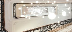 Jag tittade även på nya Nobis diagonalt över Tivoli från SAS Royal sett. Fyra år har det tagit att förvandla det gamla musikkonservatoriet till ett hotell. Sviterna högst upp är inte riktigt klara än, men resten av hotellet är öppet för gäster. Gert Wingårdh har gjort ritningarna och jag kan konstatera att arkitektfirman har plankat sig själv när det kommer till belysningen i trappan. Det ser ungefär som i ljusgården på Strand hotell i Stockholm.