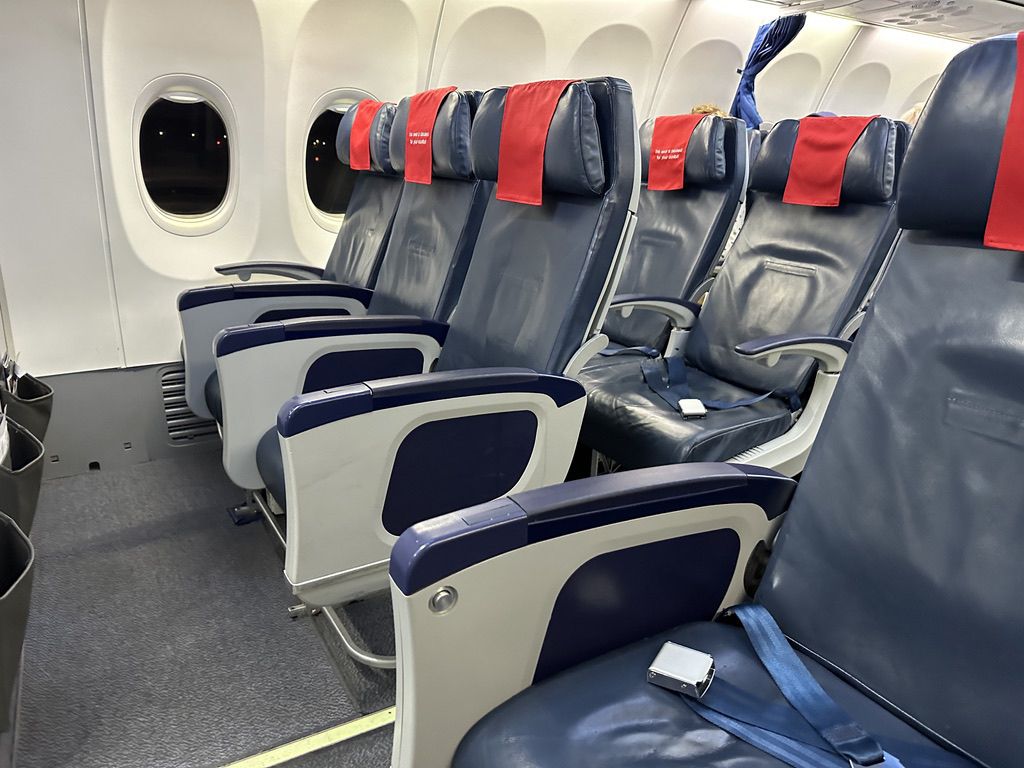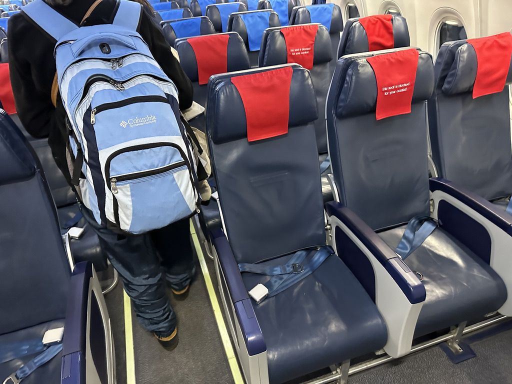 Jag har bokat plats 1A. Interiören i framdelen skiljer sig inte från längst bak. Samma 3+3-sittning, samma ekonomistolar. Enda skillnaden är att mittenstolarna inte kan bokas framme i ”affärsklassen”. Flygvärdinnan spänner fast min stora kamerarygga i mittenstolen med säkerhetsbältet som om den var en liten människa.