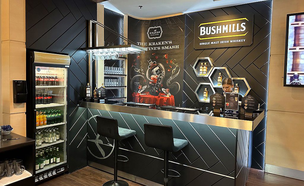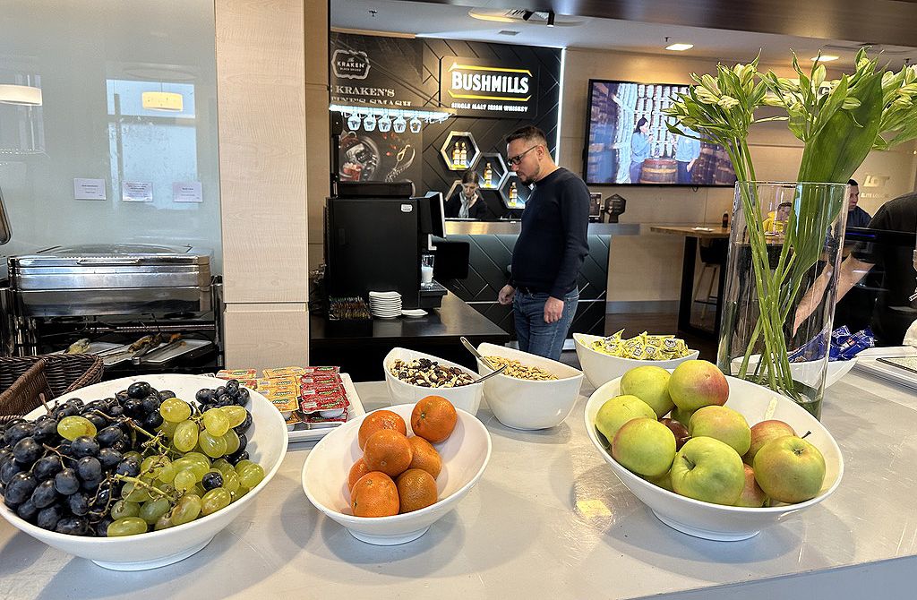 Längst bort i ett hörn av salongen hittar jag till slut en soffa som är litet bekvämare, samt ett eluttag intill under en platta i golvet. Loungen är välförsedd med mat- och fruktbuffé, en bra kaffemaskin och till och med en bemannad bar. Baren sponsras av Bushmill’s Single Malt Irish Whiskey och The Kraken Black Spiced Rum, av vilka man skapat en cocktailmeny med åtta olika drinkar.